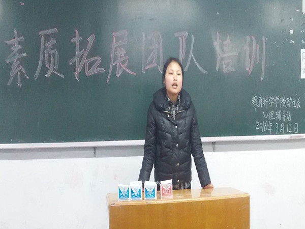 2016年3月12日,教育科学学院心理辅导站于一教208组织开展了素质拓展团队培训活动。教育科学学院2013级4班向友红受邀对心理辅导站全体成员以及素质拓展团队成员进行培训。