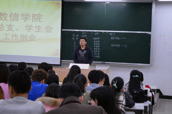 3月22日中午12点30分,数学与信息科学学院在五教南101举行了本学期第二次团学工作例会。出席本次会议的有学工办吴畏老师,党员工作站成员、各班班委以及团学全体成员,会议由宣传部干事张思敏主持。