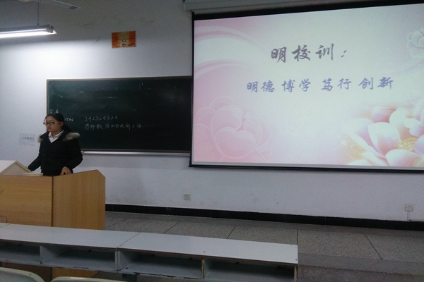 班会主要分为3个步骤进行。首先在班长点名之后,班主任马常友老师提到我校新校区动土以及我校迎来了新任校长张志远等学校的近期较大变动;“内江师范学院前身是内江师范高等专科学校和原内江教育学院……”4班班长刘建桥介绍到,“2000年3月,经国家教育部批准、四川省人民政府同意,原内江师范高等专科学校和原内江教育学院合并建立内江师范学院……”在他的讲解中,同学们对母校的认识更近了一步,了解了过去学校是如何一步一步发展的,更加珍惜如今的教学教育环境与师资人才力量。