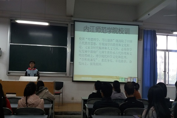 一张张有关我校的发展历史的幻灯片拉开的班会的序幕。随后,2015级2班的郭真同学向大家简单概括我校发展历史后,讲述了我校现在在硬件设备、校园环境的基本情况,今昔对比,凸显出我校发展上取得的成功,接着,郭真同学还讲到了我们学校一直很重视的“沱江学子”讲坛,这是一个活跃学术气氛,开阔学生视野,帮助学生明确学习目的,发掘学生的学术兴趣和增强学术功底,丰富我校学子校园文化生活的平台。之后2015级3班的陈钰维同学向大家讲解了校训“明德、博学、笃行、创新”的出处和含义,以及其在现实生活中对在校师生的指导意义。活动最后,2015级1班的代雨欣同学动员全部学生唱起了校歌。