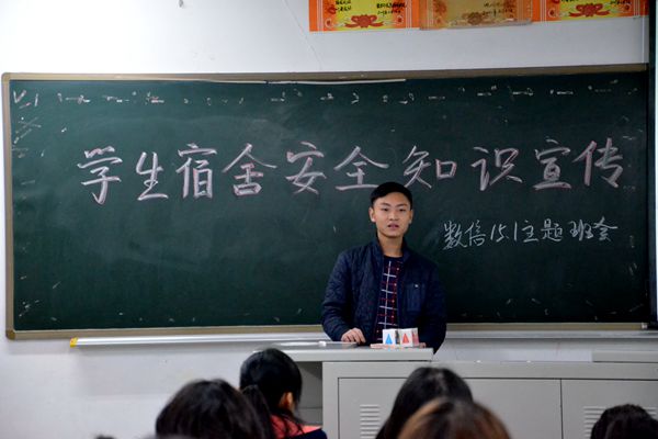 班会伊始,郑云升以PPT的形式为同学们介绍了关于宿舍安全的知识。就人生安全,财产安全及活动安全进行了细致的讲解,中途还通过播放一些有关典型案例的视频,充分的讲解了校园内以及周边存在的一些安全隐患。让同学们学到了许多安全知识,并认识到在日常生活中防患于未然的重要性,体会到生命的脆弱与可贵,及时的为同学们敲响了安全的警钟。紧接着郑云升为大家准备了一些安全知识测试题。让同学们通过自我思考,以自身经历体会去回答,以便留下深刻的印象。最后,他以幽默诙谐的语言为我们讲解了一些常备的防范措施,从而达到提高同学们安全防范能力的目的。在同学们的积极参与中,宿舍安全主题班会在吴畏的指导下划上了完美的句号。