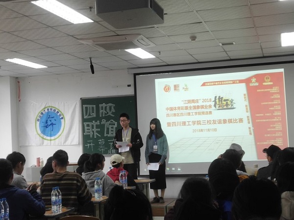 经过了1个小时的路程后,会长王景毓及参赛选手们成功抵达了四川理工学院。到达四川理工学院时,会长王景毓等人受到了四川理工学院棋类协会的成员们的热烈欢迎,并由川理棋类协会的成员带领着去与其他学校的参赛者们汇合。待所有参赛者们到齐后,川理棋类协会的会长携全体参赛者们共同举行了四校联谊开幕式,并宣布比赛的开始。
