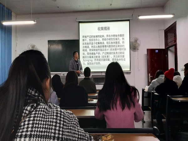 此次活动由水族创新创业协会会长唐欣向大家介绍了鱼类繁殖与苗种培育,主要包括鱼类人工繁殖、亲鱼选择、人工催产、收集精液、人工受精、脱粘孵化、苗种培育以及日常管理等。其中人工繁殖是根据鱼类的自然繁殖习性,在人工控制的条件下,通过生态、生理的方法,促使亲鱼的性腺达到成熟,排放和产出,获得大量的受精卵,并在适当的条件下最终孵化出鱼苗的过程。在亲鱼选择时要选择体格健壮,游动活力强,体表完整无伤的亲鱼。与向大家介绍了人工催产需要的药物有绒毛膜促性腺激素(HCG)、鱼类脑垂体(PG)和促黄体素释放激素A2(LRHAZ)。以及日常管理,在培育期间保持水质清新、水温稳定、溶氧稳定,每天检测水温、溶氧等,饵料投喂结束后及时清理残饵粪便。每天需要密切关注水体的水温和溶氧。