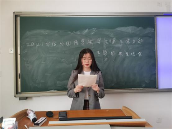 为深入学习贯彻党的十九届六中全会精神,外国语学院党总支学生第三党支部于2022年3月11日12:30在明德楼B104召开2021年度党支部专题组织生活会和开展民主评议党员。支部书记吴兆培主持会议,联系支部的党总支委员、副院长解超群到会指导,全体党员参加(其中部分大四党员云端参会)。
