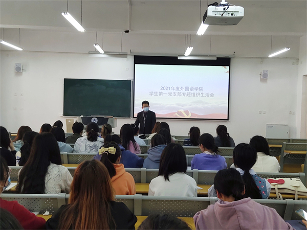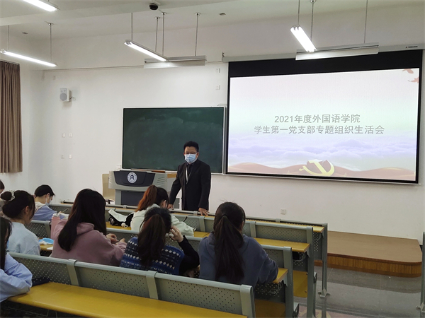 为深入学习贯彻党的十九届六中全会精神,外国语学院党总支学生第一党支部于2022年3月11日12:30在明德楼B101召开2021年度党支部专题组织生活会和开展民主评议党员。支部书记杨颖主持会议,联系支部的党总支副书记、副院长(主持工作)徐跃同志出席并指导,全体党员参加(其中部分大四党员云端参会)。