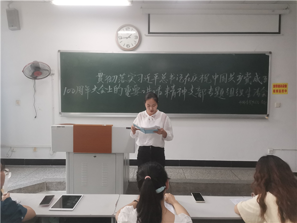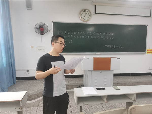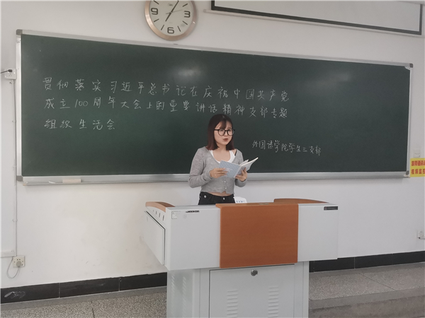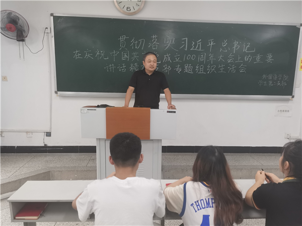 为贯彻落实习近平总书记庆祝中国共产党成立100周年大会上的重要讲话精神,2021年9月12日15:00,外国语学院学生第一、二、三支部在五教南103、104、105分别召开了专题组织生活会。会议分别由支部书记杨颖、曾乾辉、吴兆培主持,联系各支部的党总支副书记、副院长(主持工作)徐跃、党总支副书记李仰锐、党总支委员解超群参会指导工作,全体党员及预备党员参加会议。