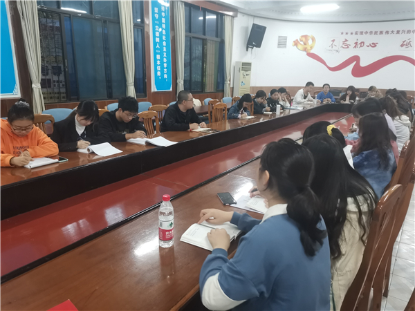 2021年10月10日9:00,外国语学院学生党支部在中心会议室开展“加强理论学习,坚定文化自信”主题党课,学生第一、第三支部书记杨颖、吴兆培,全体在校学生党员参加,在外实习党员视频连线参加,党课由学生第二支部书记曾乾辉主讲。