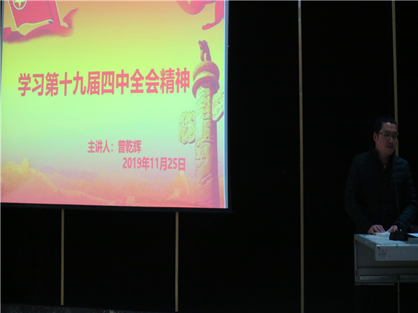 11月25日下午,在第二学术报告厅,外国语学院学生党支部组织全体党员上党课,学习党的第十九届四中全会精神,党课由学生党支部书记曾乾辉主讲。