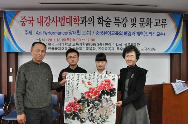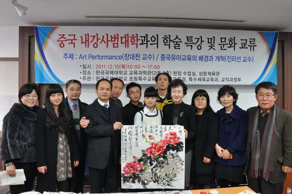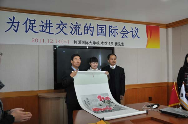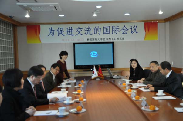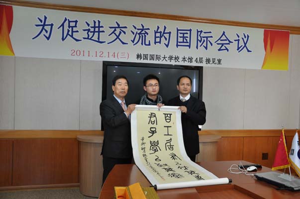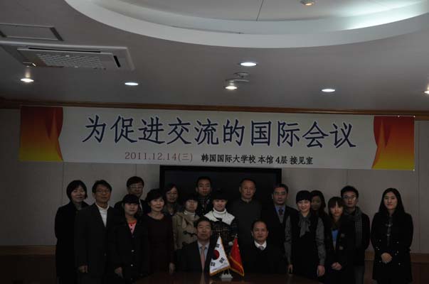 至18日,为期一周的“为促进交流的国际会议”在韩国国际大学隆重召开。由内江师范学院副书记费文晓带队,内江师范学院办公室副主任何佳,教科学院院长陈理宣,张大千美术学院院长张强及部份学生代表参加了此次交流活动。国际大学校长,国际处处长及部份二级学院院长热情接见了我校领导及师生,双方就两国的教育和文化艺术进行广泛的交流。