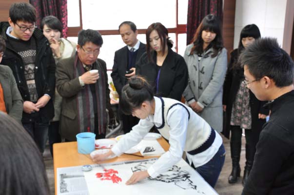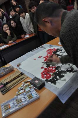 访问期间,应国际大学师生的邀请,张院长和我院学生郭永春、李保刚分别现场作画祝贺此次国际会议。提笔之际,场内鸦雀无声,所有人都屏息静气地观看我院师生现场作画。画作完成,场内掌声四起,经久不息。大家纷纷表示,中国画独特的表现力让他们倍感惊奇和神往,希望今后有更多的机会开展中韩双方的交流活动,进一步拓宽两方的合作领域及渠道,促进两国艺术与文化的推广与创新,以培养出更多具有国际视野和创新能力的人才,为两国间的文化传播和交流作出新贡献。