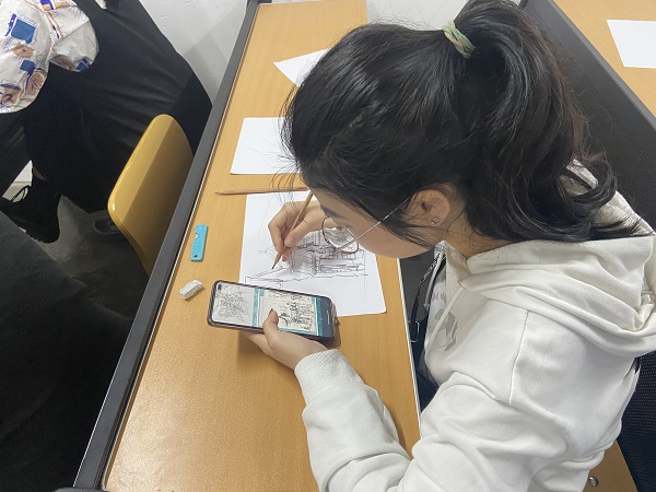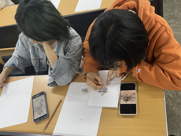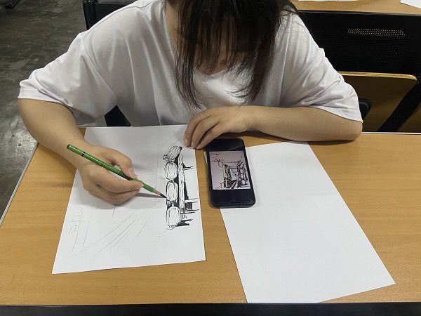 风景速写主要表现自然中的天、地、物三大关系。自然界的一切事物均发生在这三大关系中。在风景速写中,它们表现为对比关系,三大关系之间的描写手法要尽量区别,运用不同的线条,表现对它们的不同感受。在各种速写中,风景速写的难度较小,因为自然景物本身是相对静止不动的,这就减小了绘画的难度。宣传部的成员提前做好了线上宣传,组织部的成员准时到达准备签到工作,其他部门的志愿者也准时来到教室开展相应工作。在社团的志愿者们的共同努力下,此次活动圆满完成。